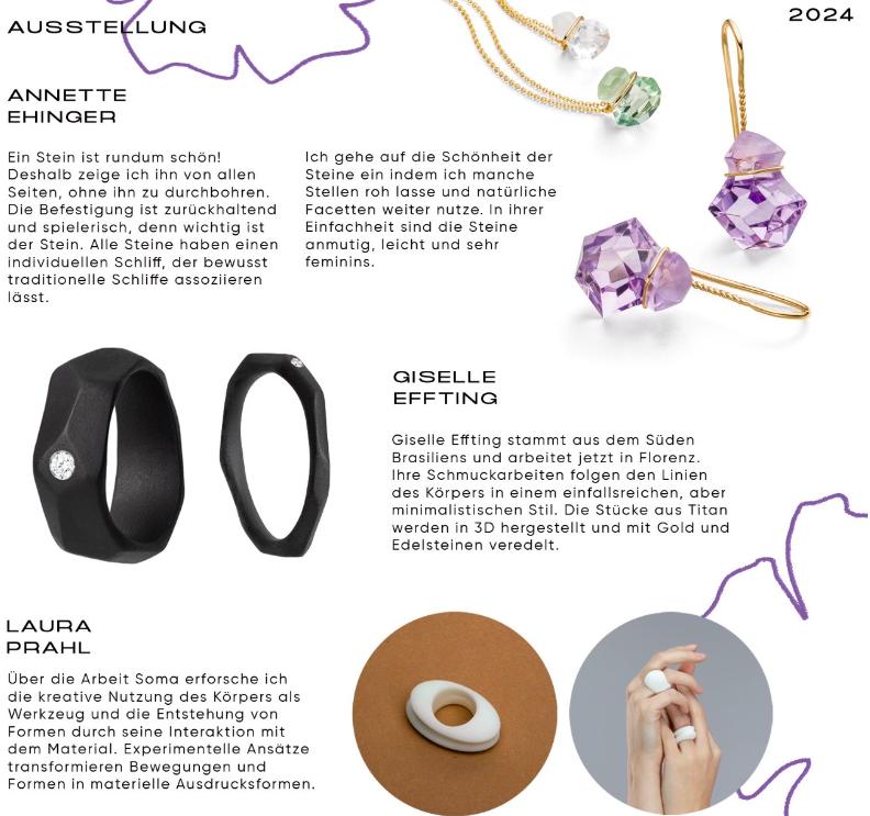 Ausstellungen Neue Räume – Neuer Schmuck / 27. April 2024 Stadtplatz 14, 3400 Klosterneuburg Eine Ausstellung mit drei neuen Schuckmacherinnen. Die Schmuckmacherin Giselle Effting ist live mit dabei.
